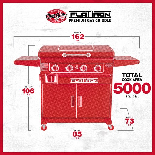 La Char-Griller® Flat Iron™ Premium Gas Griddle es una plancha de gas diseñada para quienes buscan potencia, precisión y una gran superficie de cocción al aire libre. Su placa lisa permite trabajar cómodamente con todo tipo de alimentos, desde carnes y verduras hasta desayunos completos o platos más elaborados.