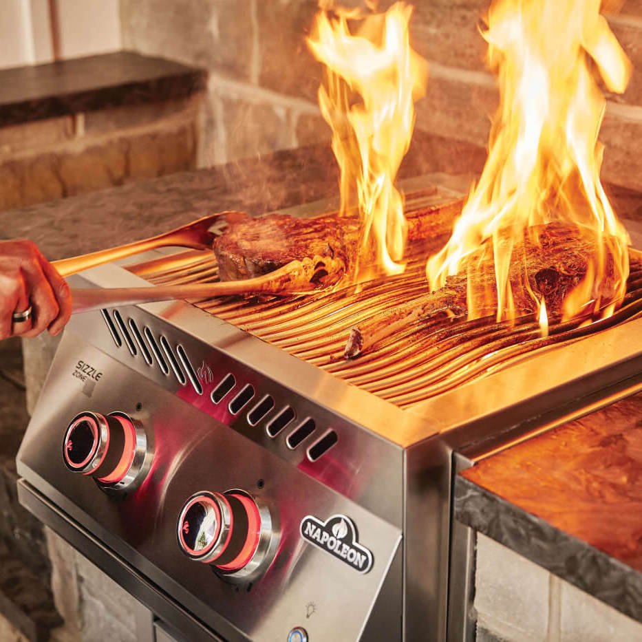 El infrarrojo SIZZLE ZONE™ puede usarse para sellar perfectamente la carne o para crear acompañamientos y salsas mientras se usa la parrilla principal. Este quemador dual infrarrojo SIZZLE ZONE™ de 45,7 cm tiene gran espacio para sellar suculentos filetes con la perfección de un restaurante. Hecho con la misma calidad de acero inoxidable marino que las parrillas integradas Serie 700, este quemador lateral hace juego con su cocina personalizada al aire libre. Estos quemadores aportan gran vida útil y estilo, y fueron fabricados teniendo en cuenta la facilidad de instalación. Las rejillas de cocción de 7,5 mm, que casi no necesitan mantenimiento, colocan el icónico sellado WAVE™ que indica que su comida fue cocinada en un artefacto Napoleon. Encienda los quemadores con una mano, con el sistema de encendido instantáneo JETFIRE™. Las ergonómicas perillas de control, que aportan ambiente y seguridad; tienen un glorioso color azul y cambian a rojo cuando se usan los quemadores. El kit de suministro eléctrico N370-1091-SER es necesario para todos los quemadores de la serie 700 integrada que se utilicen en una instalación sin una parrilla integrada de la serie 700 para poder suministrar energía a las perillas de control.